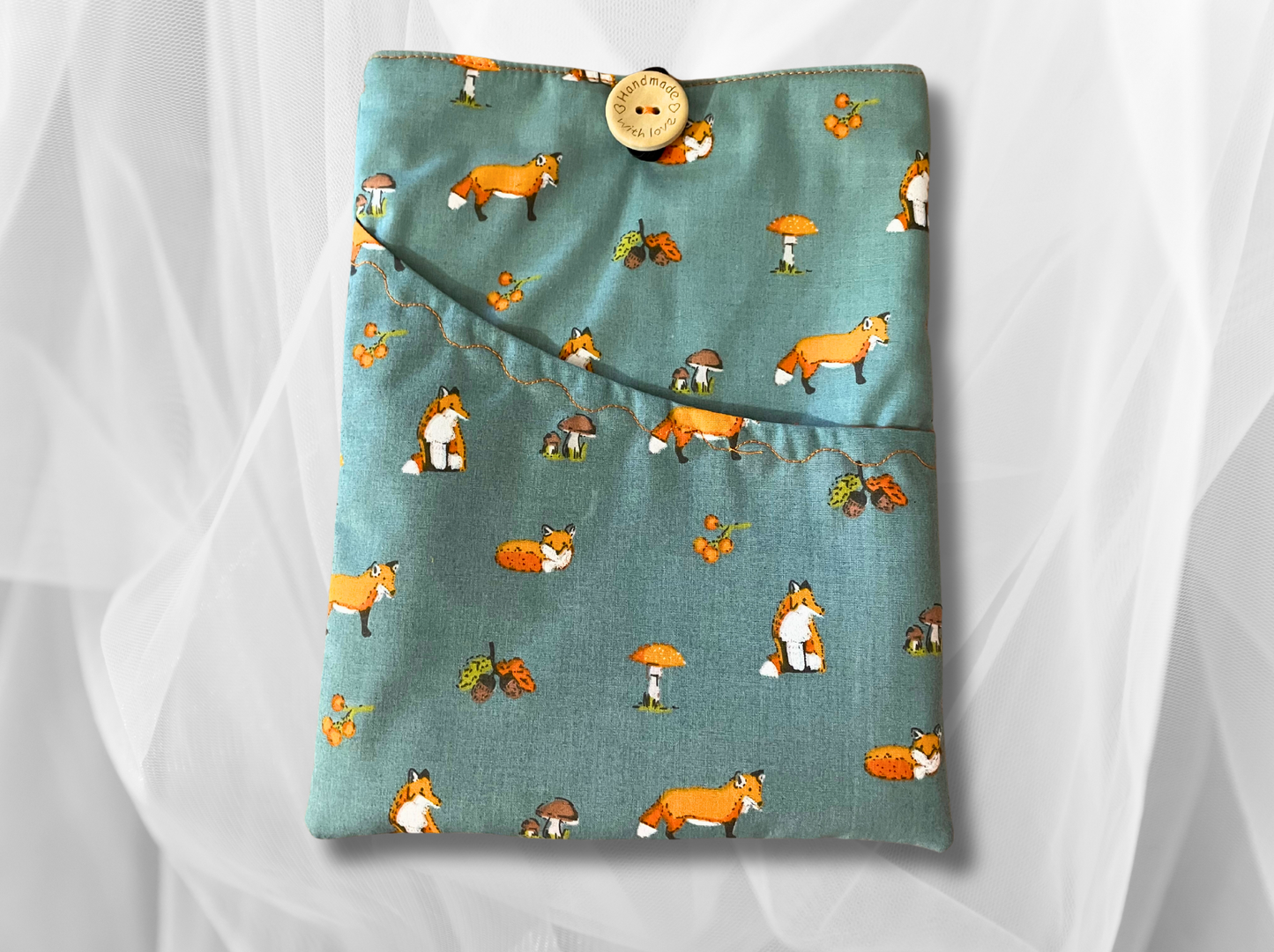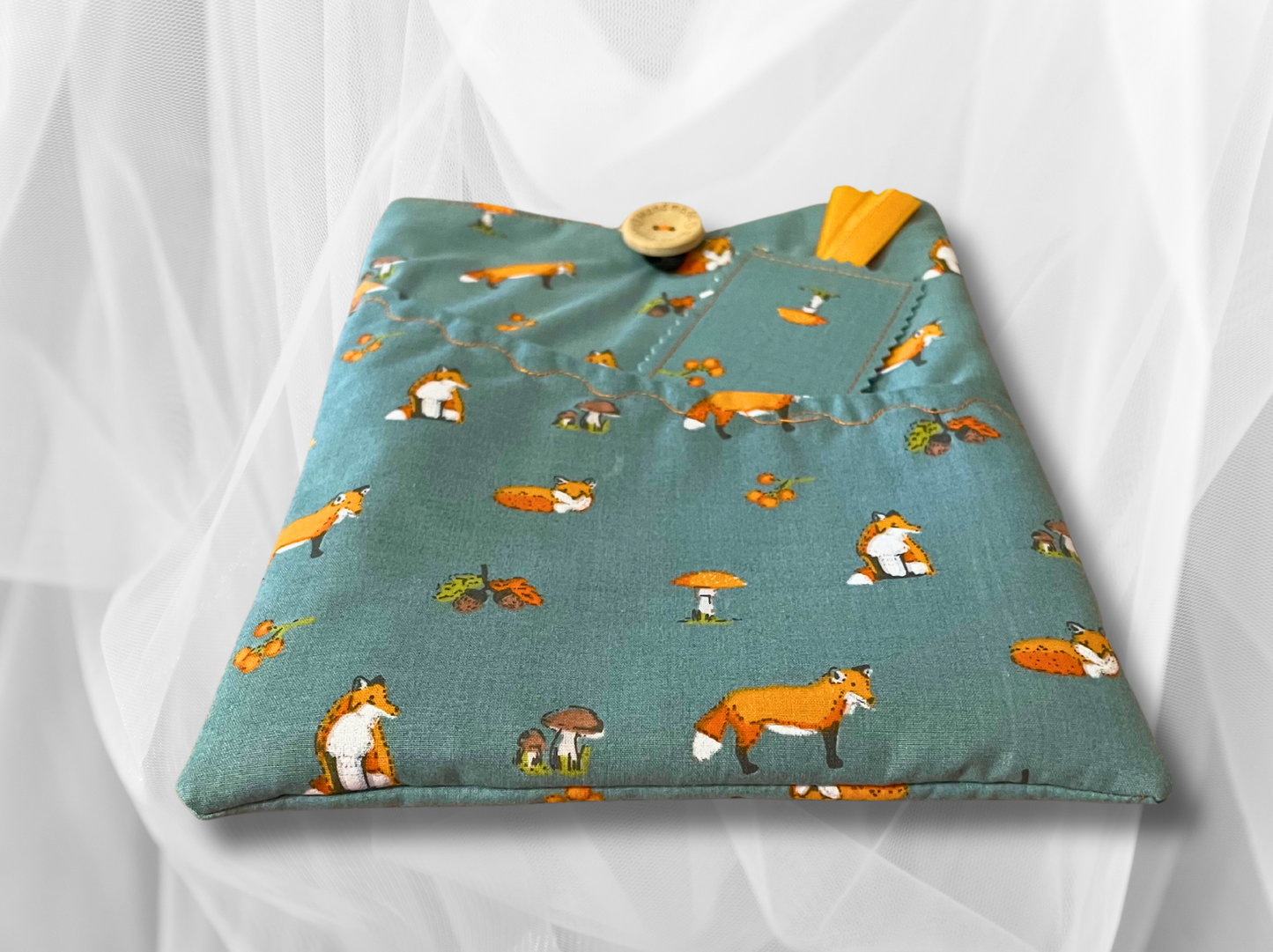This lovely soft padded book sleeve, in a lovely fox fabric, has a handy front pocket for notes, reading glasses, pen etc.