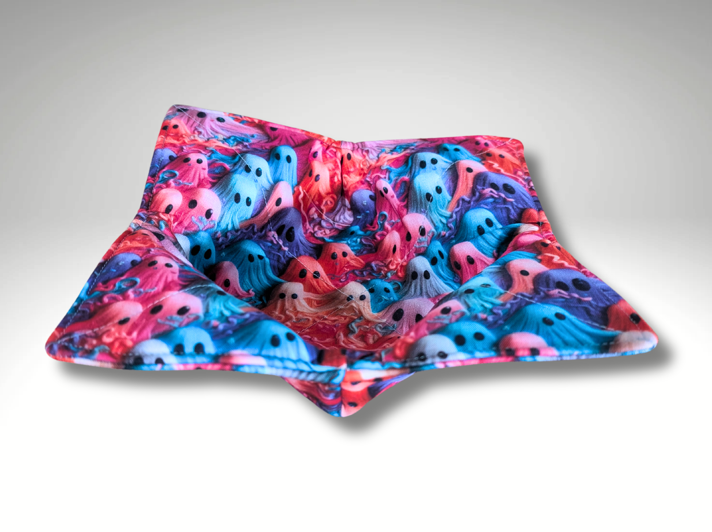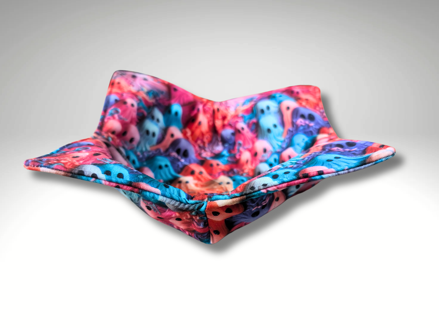 A cute bowl cozy in a colourful ghost fabric.