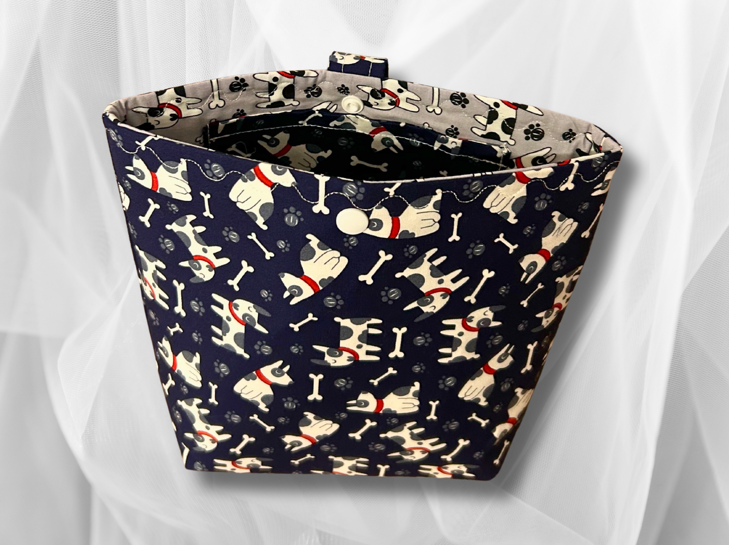 A great car accessory in a fun puppy and bone cotton fabric. Outer fabric has a navy background and inner lining has the same dog and bone pattern with a grey background.