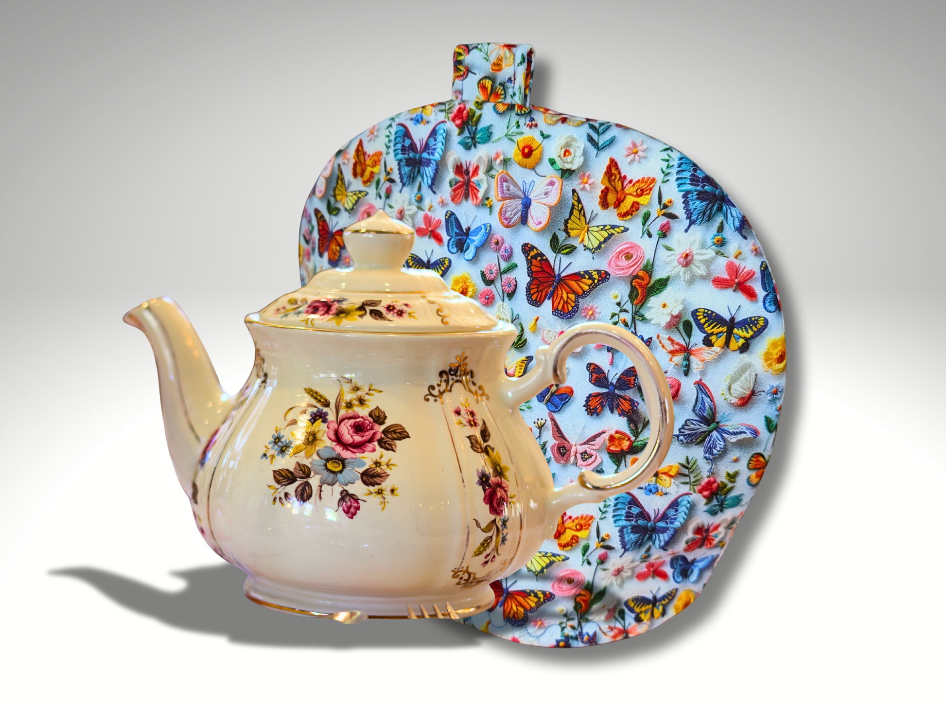 A Stunning handmade Egg Cosy in a 3D Effect Butterfly Fabric.