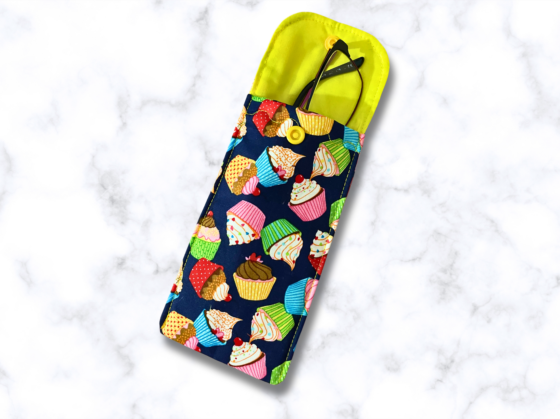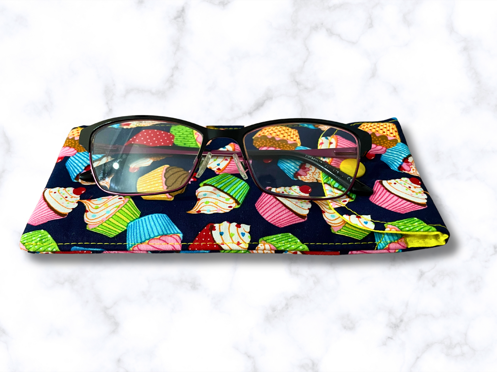 Glasses case in a soft cotton poplin fabric, with a fun and colourful cupcake design.