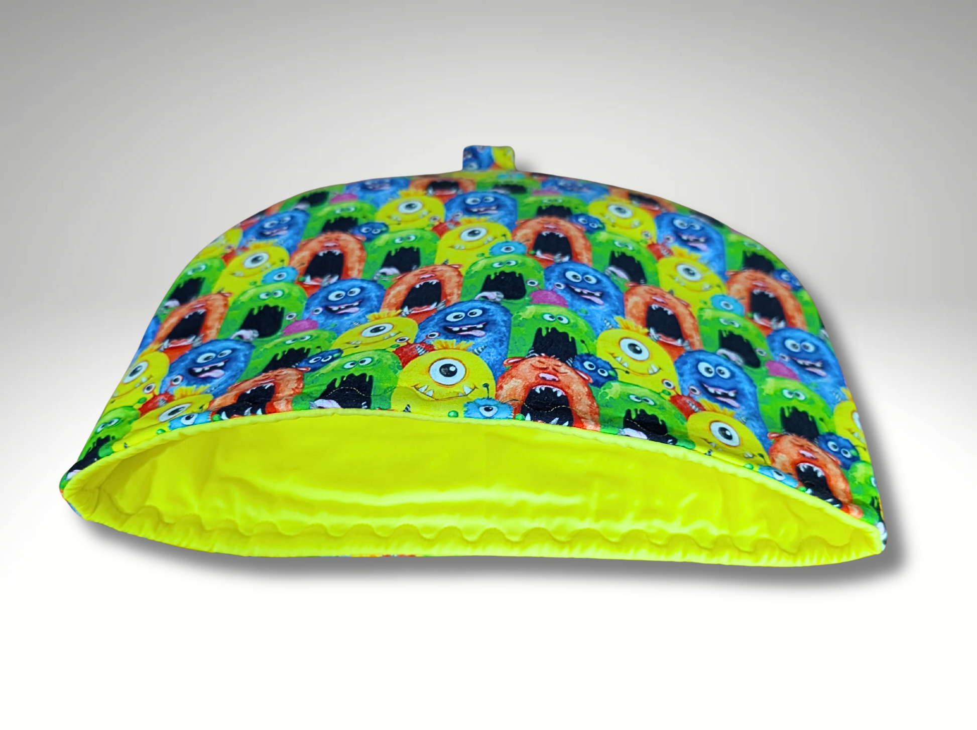 A Stunning handmade Tea Cosy in a colourful and fun monster print Fabric.